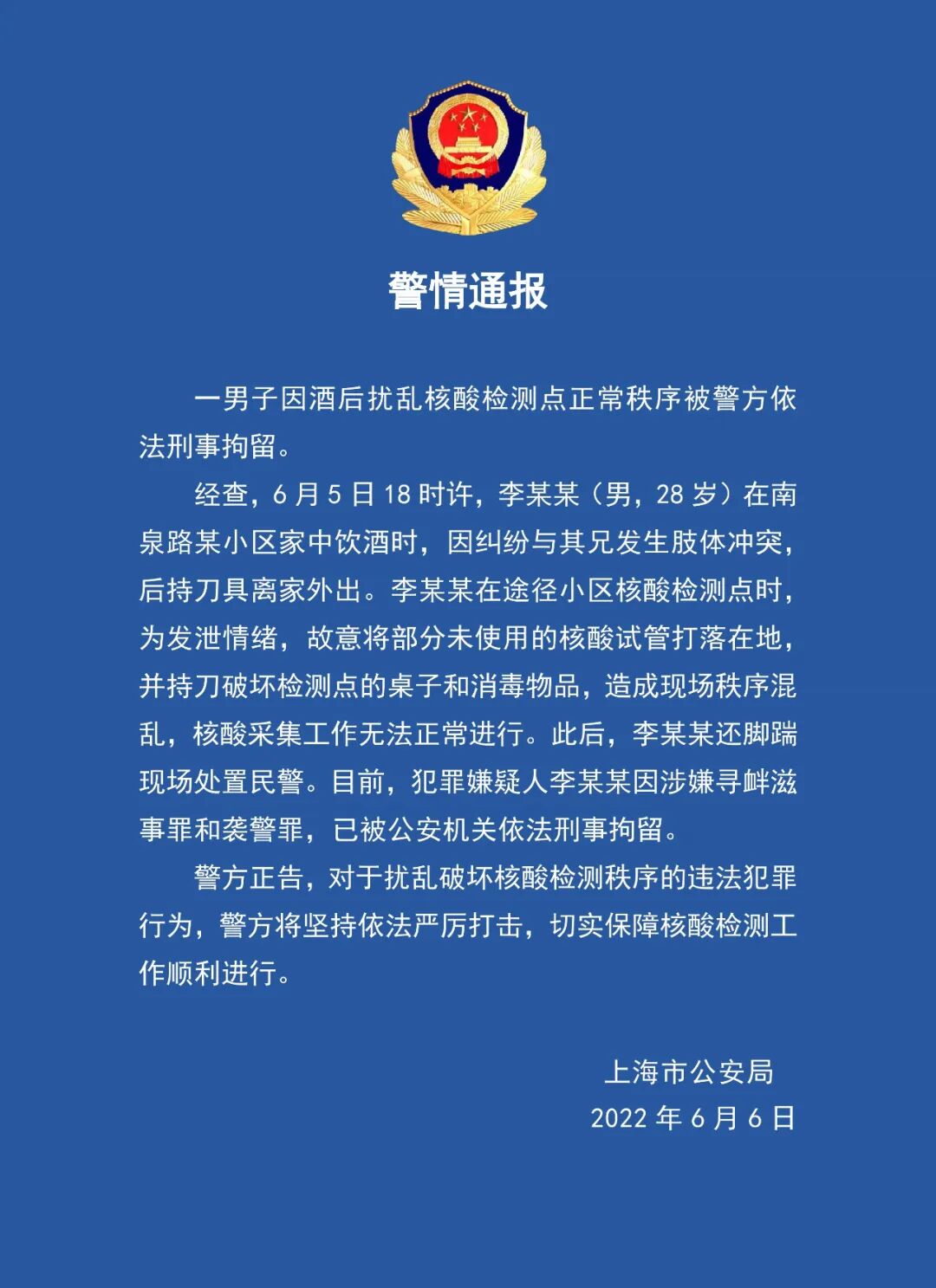 沪一男子酒后破坏核酸检测点,刑拘!
