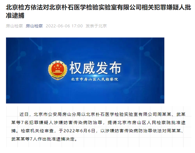 6月6日下午,据北京市人民检察院消息,近日,北京市公安局房山分局以北京朴石医学检验实验室有限公司周某某、武某某等7名犯罪嫌疑人涉嫌妨害传染病防治罪,提请北京市房山区人民检察院批准逮捕。