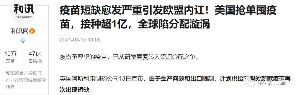 比如2021年3月15日和讯网曾经报道,新研发的疫苗由于受到产能严重局限,首先爆发欧盟和北美的分配份额之争。包括德国作为研发核心所在及欧盟,竞争不过美国,欧盟内部也因为份额分配问题闹得不可开交。霉国唯我独尊抢单囤货,五眼联盟的阴国加拿大也没分到好处。