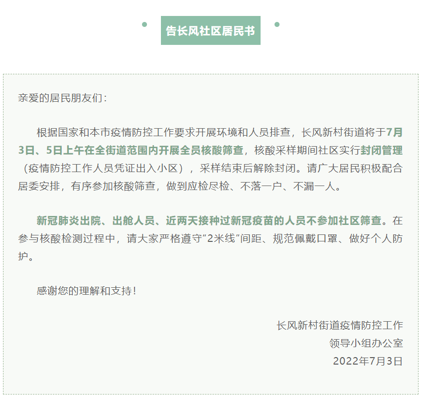 上海两街道告居民书7月3日、5日上午全员核酸筛查
